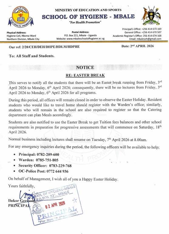 This is to notify all students and staff that there will be an Easter break running from Friday, 3rd April 2026 to Monday, 6th April 2026. Consequently, there will be no lectures during this period for all programs.